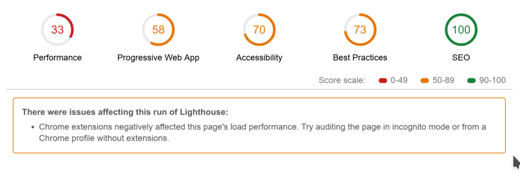 Я был немного удивлен услышанным, т.к. это был сайт на Joomla на бюджетном шаред-хостинге, с косяками адаптивной версии, неоптимизированными прозрачными PNG-шками по несколько мегабайт весом. В перерыве между работой ради интереса решил замерить баллы, правда через встроенный в Google Chrome Lighthouse.