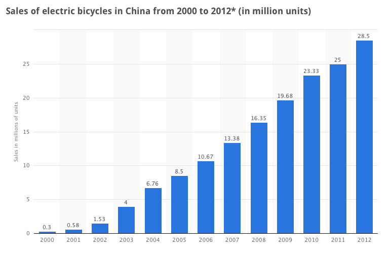 Посмотрите на график продаж электровелосипедов в Китае с 2000 до 2012 года. А к 2015 году прогнозируется рост до 35 миллионов. Рынок электротранспорта сейчас целиком нацелен на Европу. И с каждым годом процесс покупки электро комплектующих становится проще и доступнее.