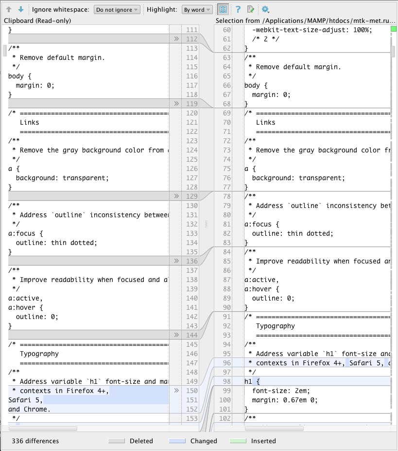 Немного успокоившись от увиденного, я начал делать адаптивную версию. Но и тут меня ждал сюрприз. Дело в том, что я использую LESS-препроцессор для генерации CSS. Потому, что удобно и быстро. Догадываетесь, о чем я? Интуиция и тут не подвела. Бэкаплю текущий template.css, затем генерирую новый через LESS, делаю DIFF и что я вижу?