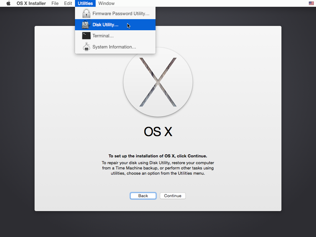 2. Не запуская установку, запустить из меню сверху Дисковую Утилиту (Disk Utility), в ней размонтировать жесткий диск, на который установлена Mac OS X.