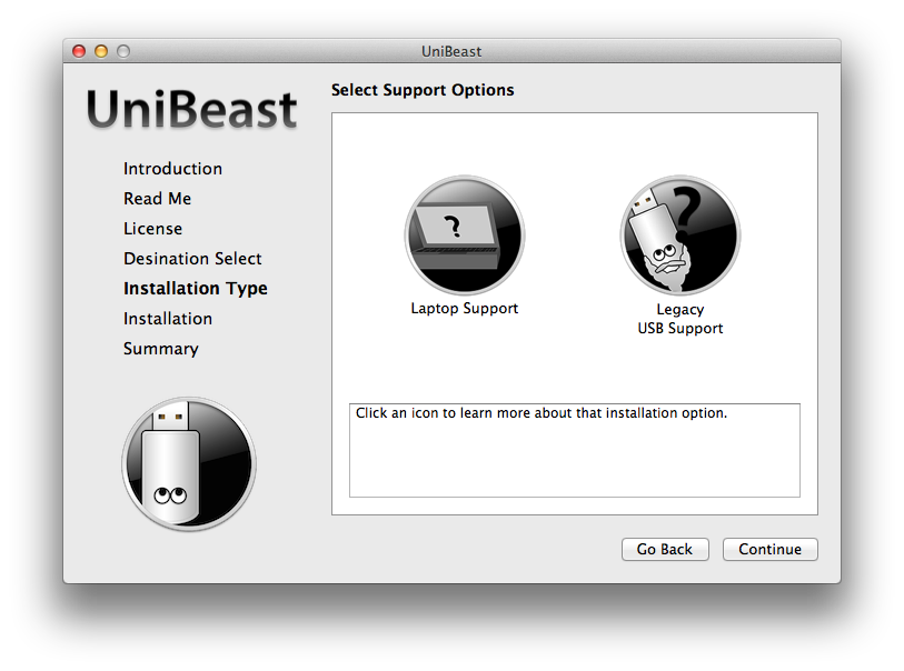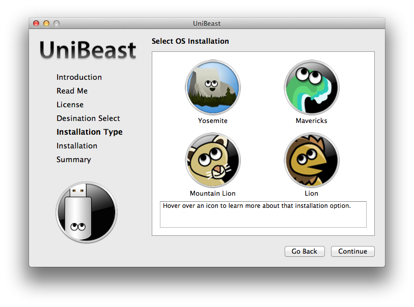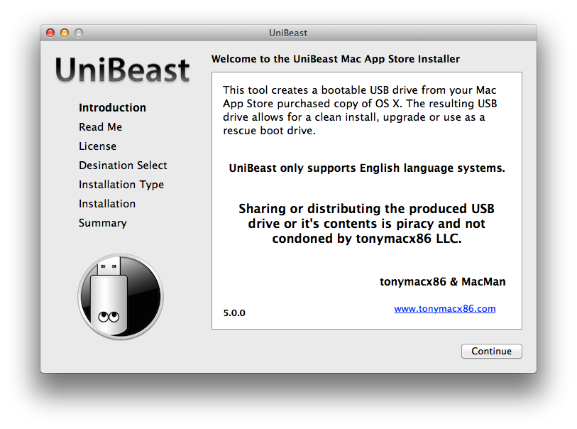 UniBeast — это утилита, которая поможет создать загрузочный диск с Mac OS для установки. Для создания вам потребуется уже существующий ПК с Mac OS, либо виртуальная VmWare с предустановленной Mac OS. Виртуальную машину с Mac OS можно найти на rutracker.org, там же и инструкции по установке.