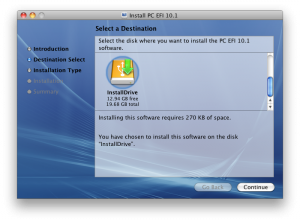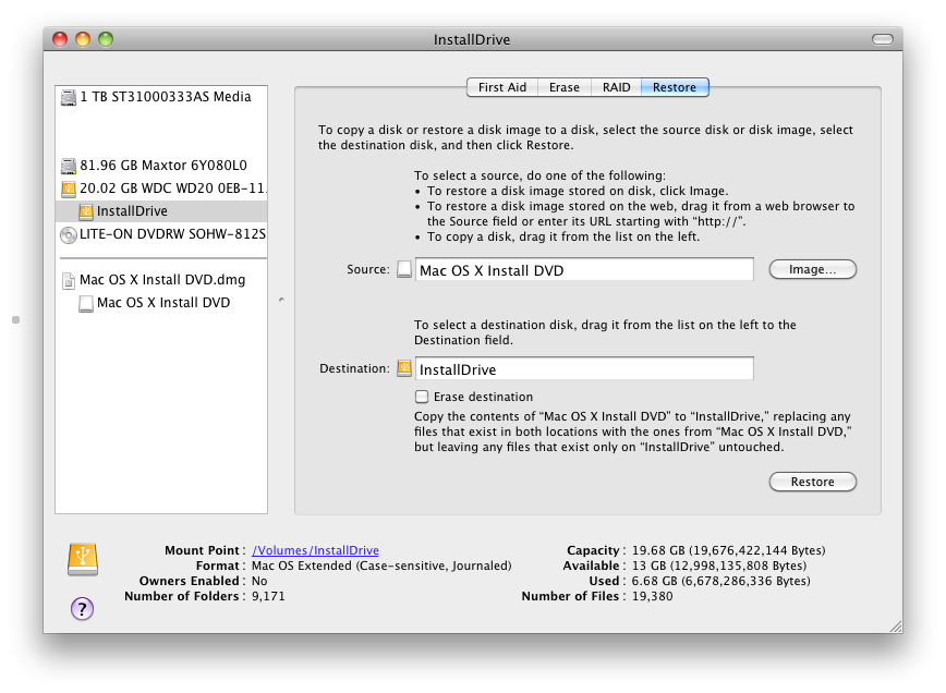 - В качестве источника выбираем Mac OS X Intall DVD, а назначением — наш раздел InstallDrive.